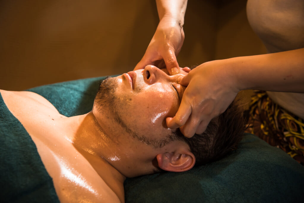 お顔にオイルトリートメントを施して眼精疲労に効くポイントを深く刺激し