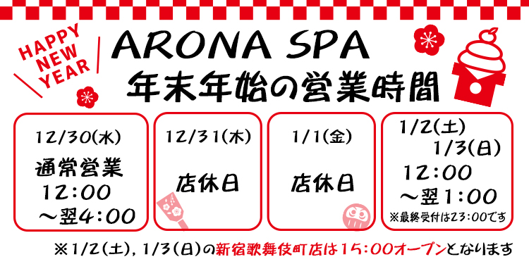 AronaSpa年末年始の営業時間 | 渋谷でリラクゼーションサロンをお探しならARONA SPA(アロナ・スパ)へ渋谷でリラクゼーションサロンをお探しならARONA SPA(アロナ・スパ)へ