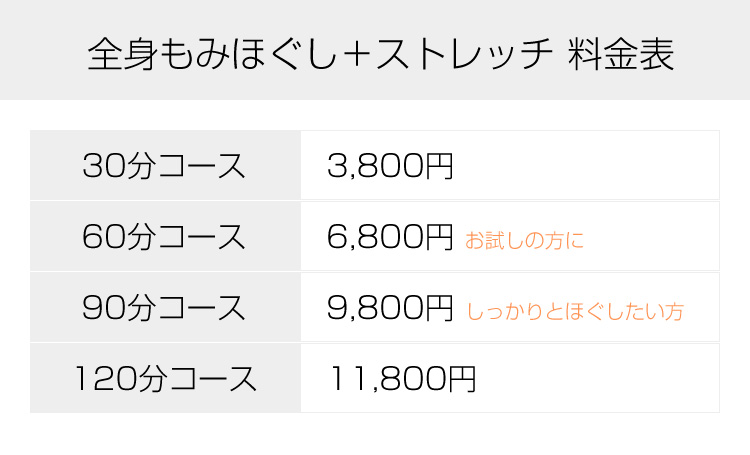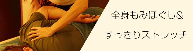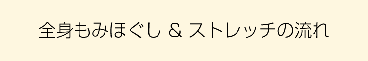 気づかぬうちに緊張して固まってしまった筋肉を軽いストレッチをして伸ばしてからもみほぐしをしていきます。ストレッチと合わせて行うことで、筋肉の緊張やコリなどもほぐれやすくなります。