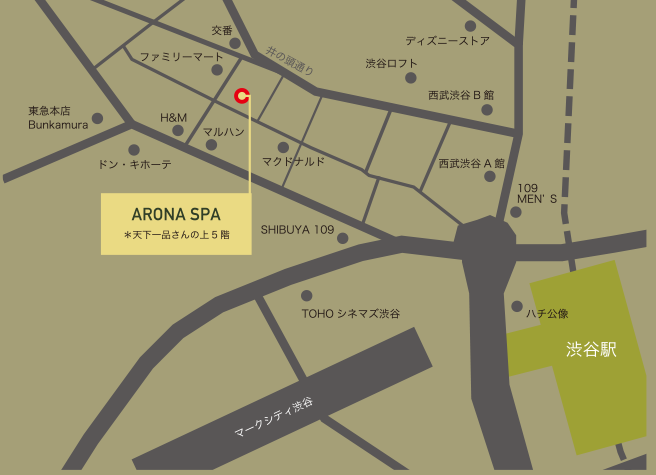 ようこそ『ARONA SPA』へ。渋谷センター街の入口から真っすぐ進んで頂いて徒歩2分!